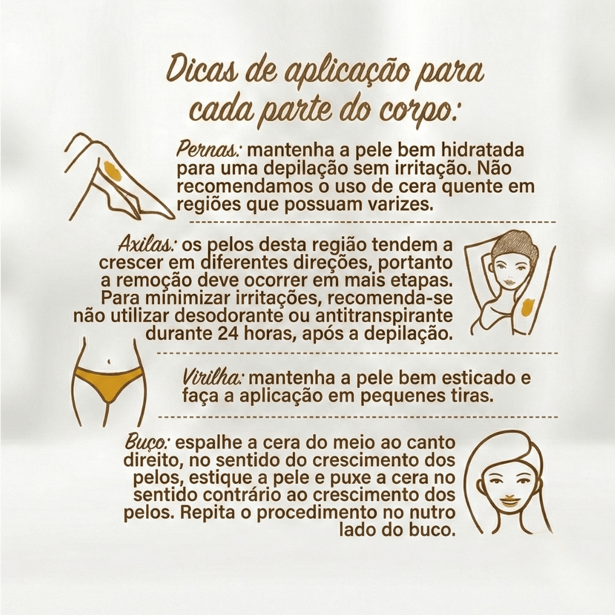Evite exposição ao sol 24 horas ante e 48 horas apos a depilação. Não aplique o produto mais de uma vez no