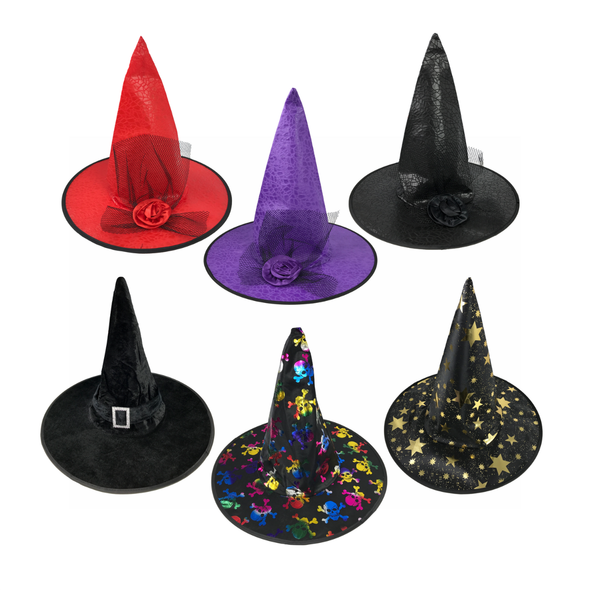 Com seu formato pontudo e design marcante, o chapéu é perfeito para fantasias de bruxa, decoração temática ou até mesmo para divertir crianças e adultos em brincadeiras de Dia das Bruxas. Ele é leve, confortável e se adapta facilmente à cabeça, garantindo praticidade e diversão durante toda a comemoração.