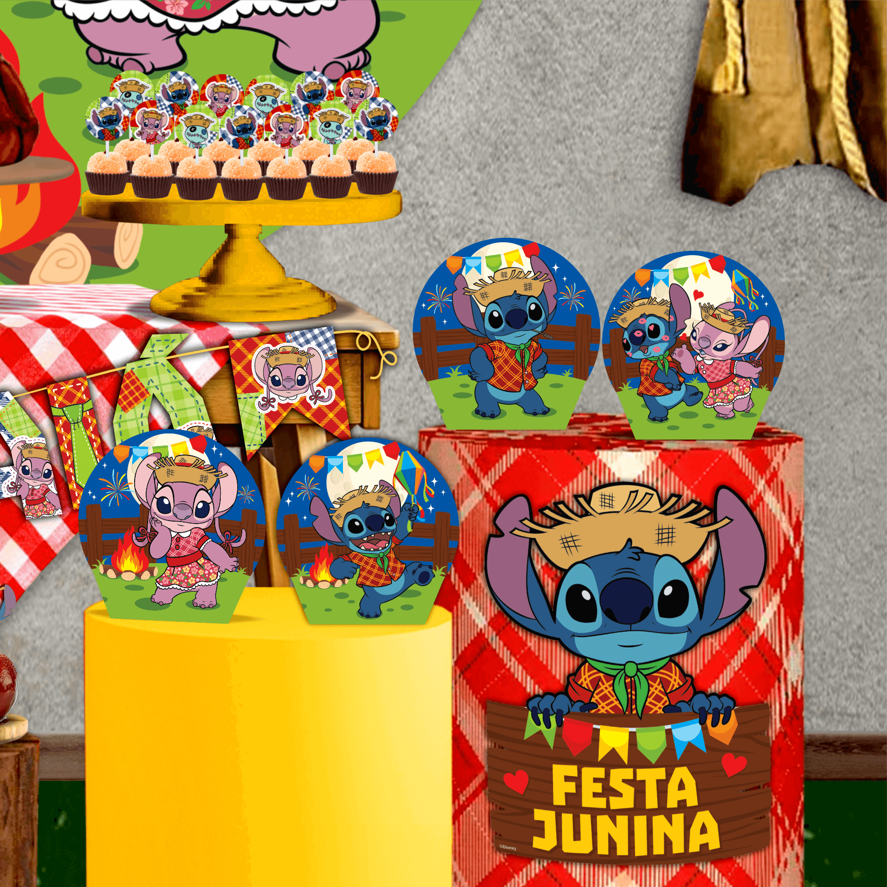 Estampas: Stitch e Angel em trajes juninos, com elementos temáticos como fogueira, bandeirinhas e balões